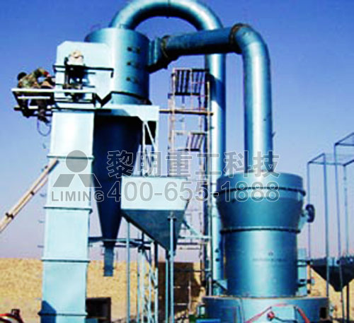 大塊狀物料經(jīng)顎式破碎機破碎到所需要粒度后,由提升機將物料送至儲料斗,再經(jīng)振動給料機均勻定量連續(xù)地送入主機磨室內(nèi)進行研磨。粉磨后的粉子被風(fēng)機氣流帶走,經(jīng)分析機分級,符合細(xì)度的粉子隨氣流經(jīng)管道進入大旋風(fēng)收集器內(nèi),進行分離收集,再經(jīng)粉管排出成品粉子。
